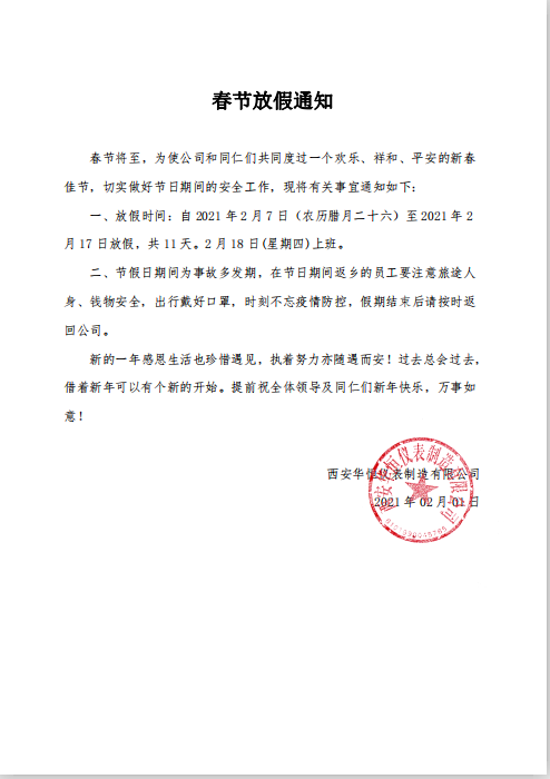 春節(jié)將至,為使公司和同仁們共同度過一個歡樂、祥和、平安的新春佳節(jié),切實做好節(jié)日期間的安全工作,現(xiàn)將有關(guān)事宜通知如下: