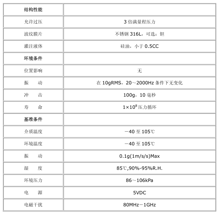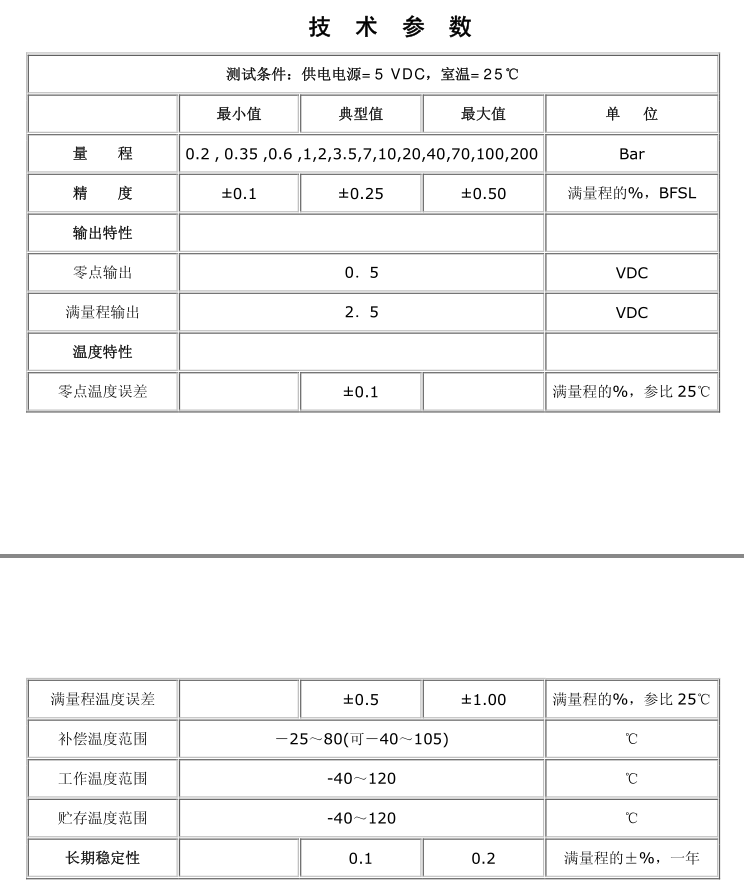 是將充油擴散硅壓力傳感器芯體,通過激光焊接方式,裝入特定螺紋的壓力接口中組成。所有產(chǎn)品經(jīng)嚴(yán)格測試和篩選,利用MAX1452專用芯片進(jìn)行溫度補償和非線性校正,典型精度為0.25%,最高精度優(yōu)于0.1%,并保證在-25到80度工作溫區(qū)(最大可在-40到105度),全溫區(qū)測量精度在1%以內(nèi),5V供電,輸出0.5-2.5V電壓信號,適用于各種不同壓力測量產(chǎn)品的組裝和生產(chǎn)。