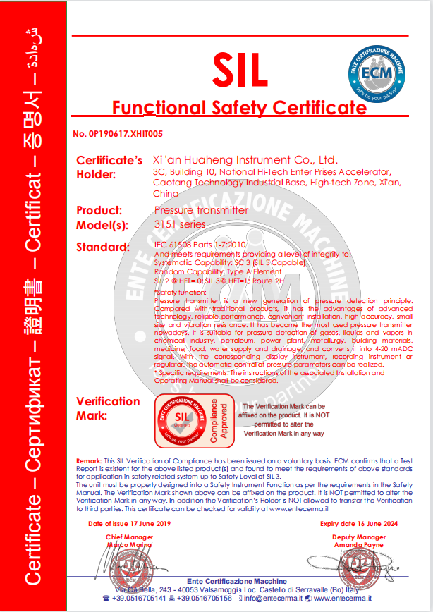 壓力/差壓/液位變送器SIL2(SIL3)認(rèn)證證書