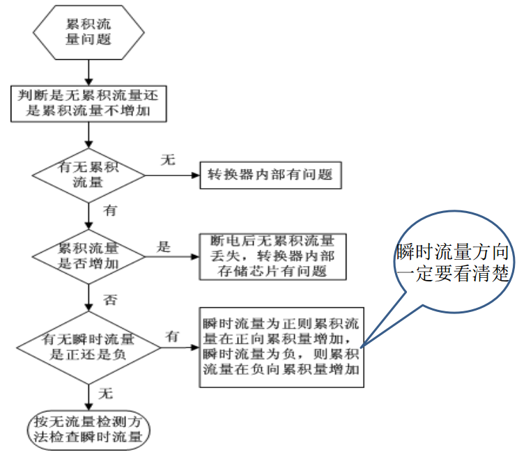無流量信號、信號波動、零點(diǎn)不穩(wěn)、無累積信號、流量測量值與參比值不符,通常檢查整個(gè)測量系統(tǒng)和判斷故障的程序如圖: