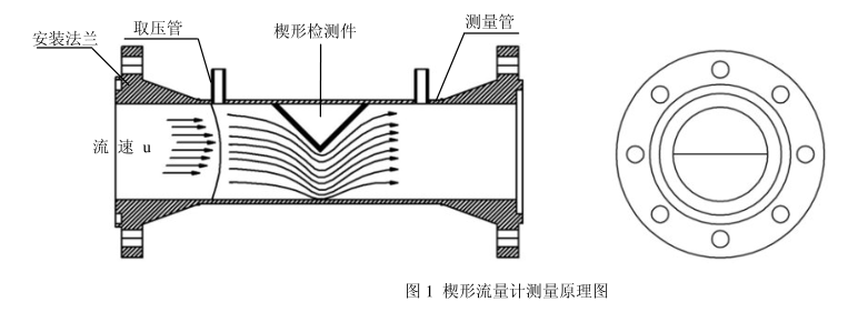 楔形流量傳感器結(jié)構(gòu)如圖1所示。楔形流量傳感器的檢測件是楔形孔板,它是一塊V形節(jié)流件,它的圓形頂角朝下,這樣有利於含懸浮顆粒(粉塵、泥沙及其它固體顆粒)流體和高粘度液體流過時在節(jié)流件上游側(cè)不會產(chǎn)生滯流,也不會在節(jié)流體上、下游側(cè)發(fā)生固體顆?;蛘吵砦锏姆e存,從而確保了楔形流量傳感器長期運行穩(wěn)定性:±0.1FS%Y,這樣高的長期運行精度在流量測量領(lǐng)域是迄今少見的。