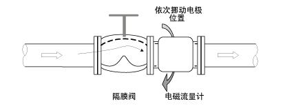 即使平時將隔膜閥完全打開使用,也會由于流速分布不均使電磁流量計產生幾個百分點的誤差。把電磁流量計安裝至閥門的上游可以解決問題,但是由于過程運行上不允許這樣做,所以利用電磁流量計的安裝螺孔,依次挪動電極位置,找到一個可以獲得最接近理論流量值的位置(如下圖),便解決了問題。