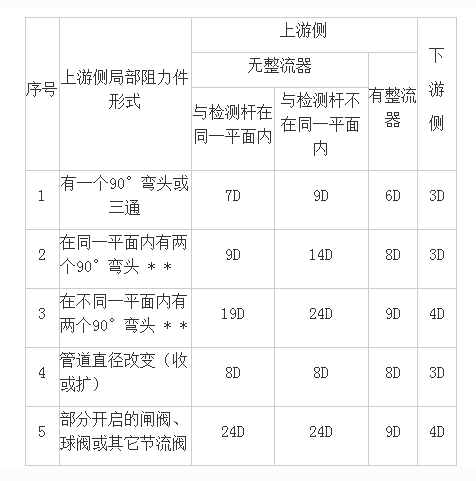 1、安裝檢測桿的測量段應(yīng)是直的,其上下游直管段長度參照下表所規(guī)定的長度,序號上游側(cè)局部阻力件形式上游側(cè)下。