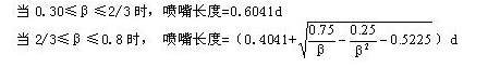 標(biāo)準(zhǔn)噴嘴由垂直于軸線的入口平面部分A、圓弧形曲面B和C所構(gòu)成的入口收縮部分、圓筒形喉部E和為防止邊緣損傷所需的保護槽F組成,其取壓方式上游采用角接取壓,下游可按角接取壓設(shè)置,也可設(shè)置與較遠的下游處。噴嘴總長度: