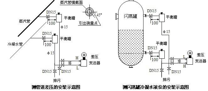 2、測(cè)量液體流量時(shí),差壓變送器應(yīng)安裝在被測(cè)管道的旁邊或下面,以便氣泡排入管道中;或上面,以便積聚的液體容易流入管道中;下面,以便冷凝水能充滿在引壓管中。