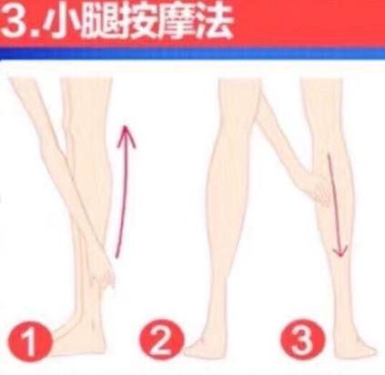 1兩手交替由腳踝自下而上向膝蓋部位按摩小腿肚,左右腿各重復(fù)30次