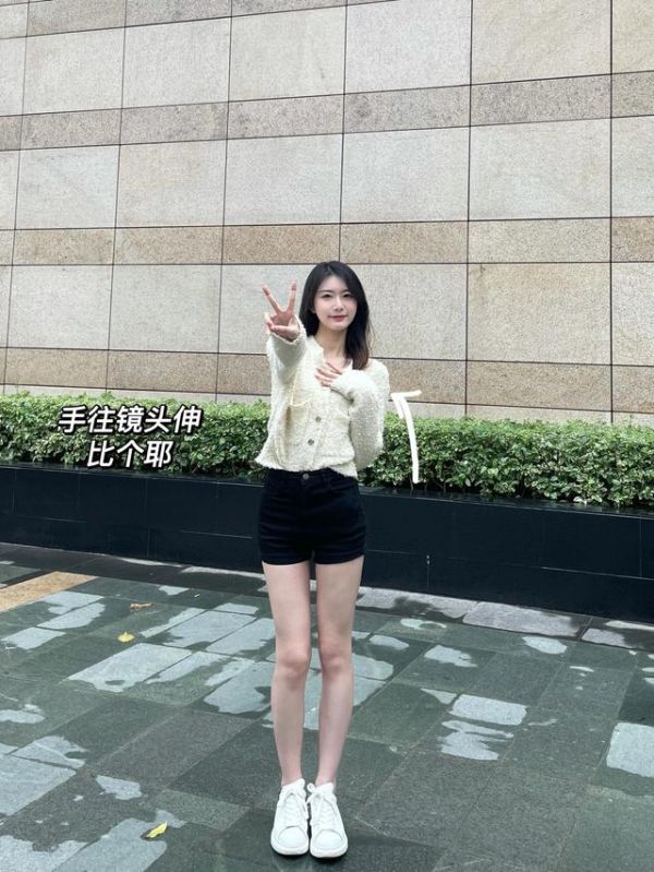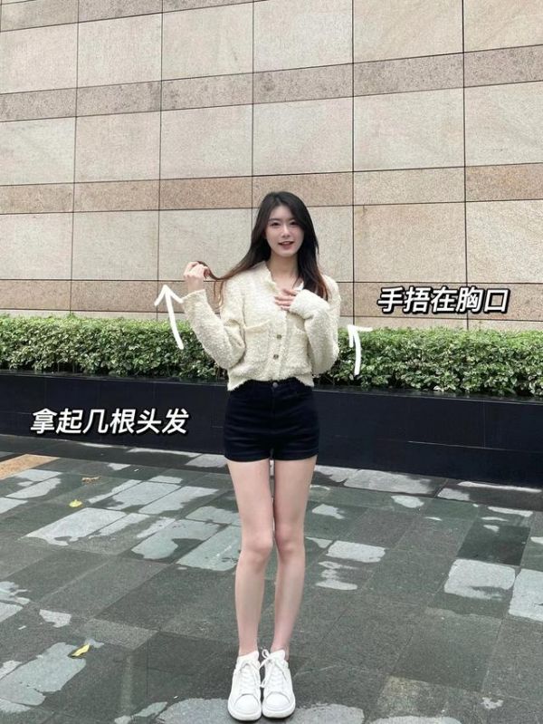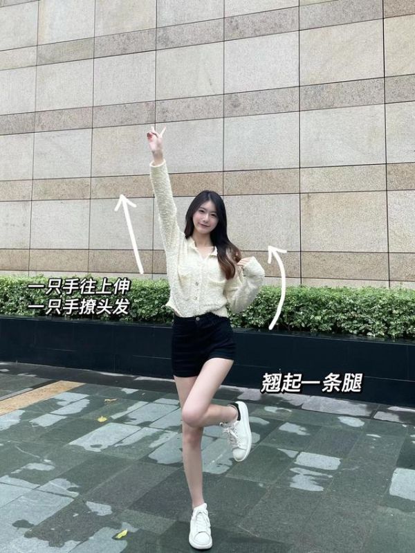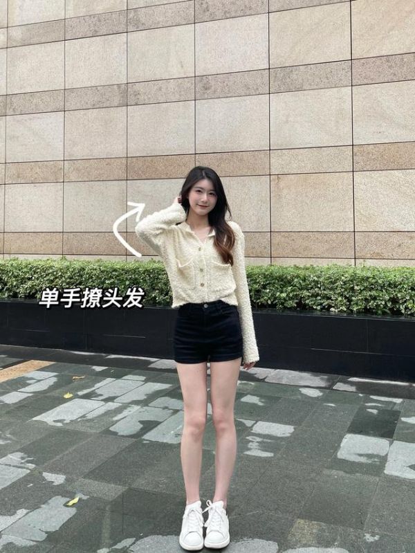 身材較嬌小的女生,除了要保證顯高顯瘦的角度和機(jī)位,也能借助舉手的動(dòng)作,在視覺上制造顯高的效果,將手舉起,雙手或單手都可以,讓手呈現(xiàn)V字形即可,整體顯高不少。