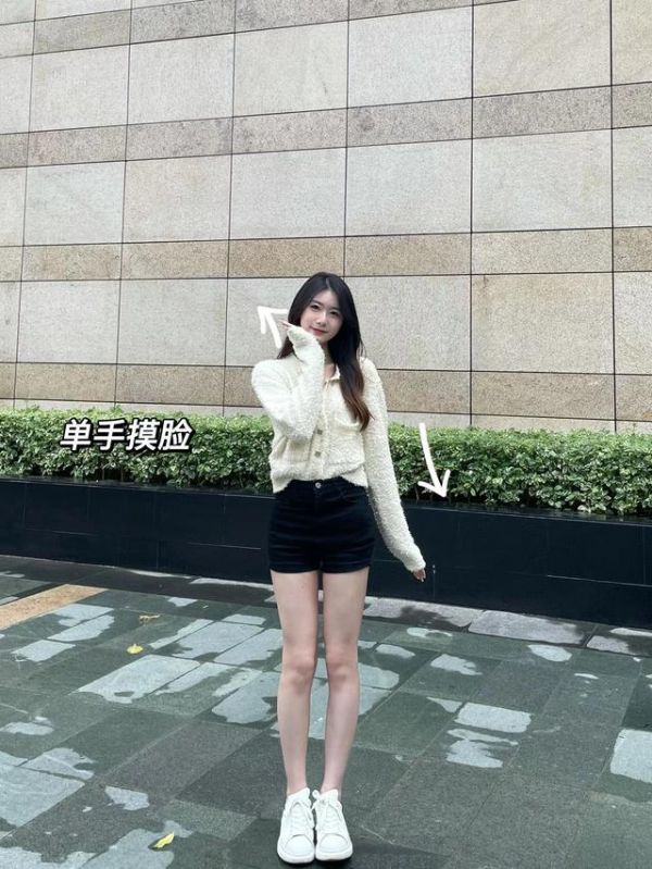 拍全身照除了要顯瘦顯高之外,面部的狀態(tài)也同樣重要,如果擔(dān)心自己拍照不上鏡,可以單手摸臉,配合上頭發(fā)的遮擋效果,輕松顯臉小。另外一手不要與大腿緊貼,將手往下壓,視覺上有顯瘦的效果。