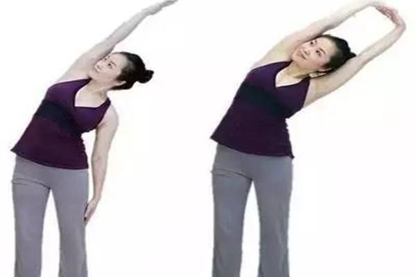 呼氣:左臂帶動上體向右側(cè)彎,兩側(cè)側(cè)腰等長,背部保持在一個平面上,眼看左手指尖方向。