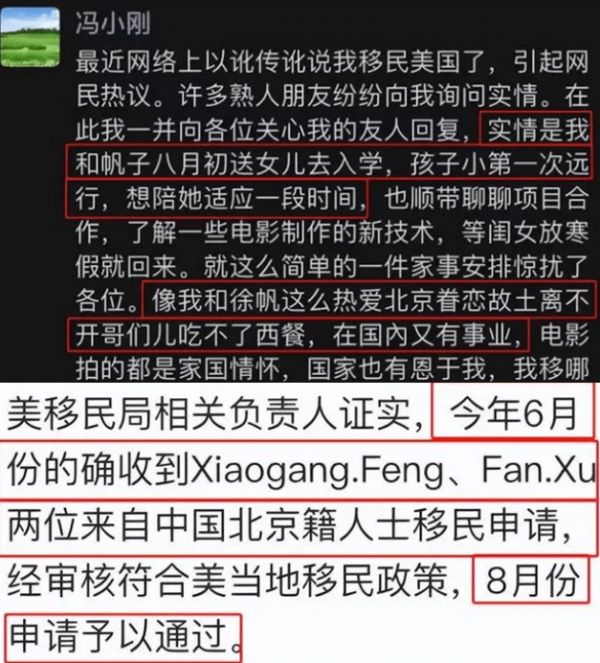 雖然后續(xù)有一張疑似馮小剛朋友圈的辟謠截圖流出,可相關(guān)人員向美移民局負(fù)責(zé)人證實(shí),早在去年6月份便收到了“Xiaogang.Feng、Fan.Xu”兩位中國(guó)北京籍人士移民申請(qǐng)。籍貫與名字拼寫如此一致,想來除了馮小剛和徐帆夫婦也沒有其他人。