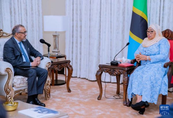 1月20日,坦桑尼亞總統(tǒng)薩米婭·蘇盧胡·哈桑(右)在首都多多馬與世界衛(wèi)生組織總干事譚德塞舉行會談。