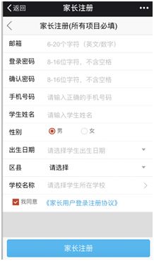 為了孩子信息的安全性、保密性,在填好學(xué)生的基礎(chǔ)信息之后還需要閱讀《用戶協(xié)議》,閱讀完之后勾選接受按鈕并點(diǎn)擊注冊(cè),完成家長(zhǎng)注冊(cè)。