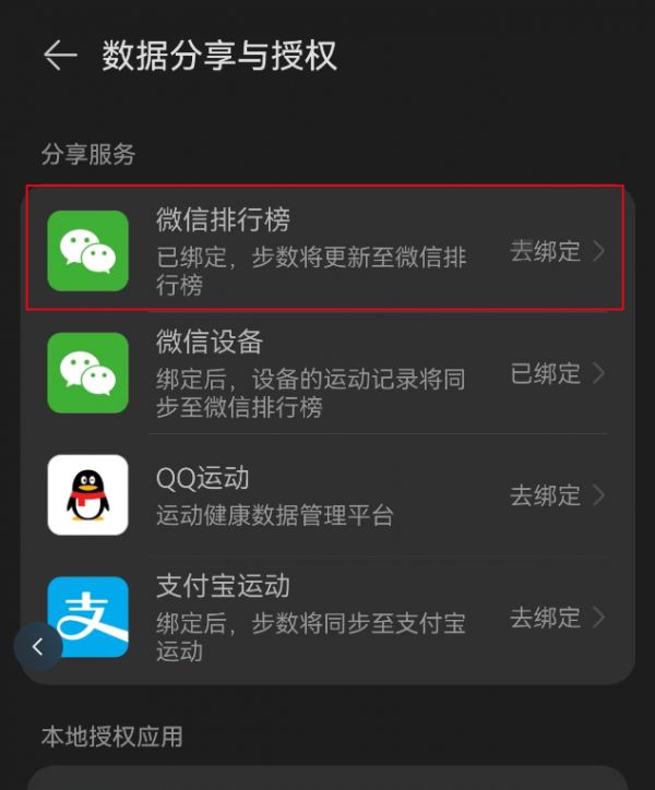 如果以前綁定過想換綁的,打開華為“運(yùn)動(dòng)健康 APP”,點(diǎn)擊 我的 > 隱私管理 > 數(shù)據(jù)分享與授權(quán) > 微信排行榜,里面會(huì)顯示"已綁定"。