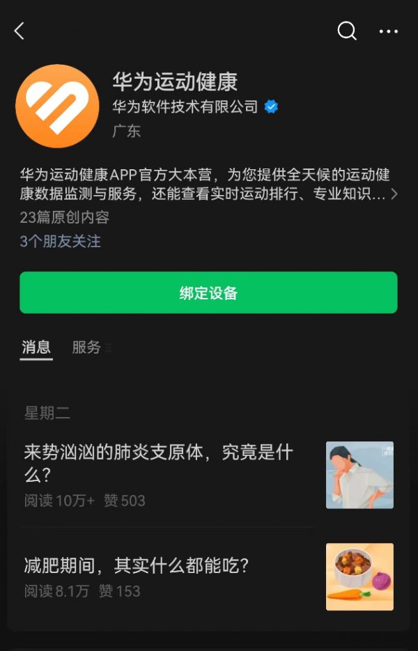 點(diǎn)擊"綁定設(shè)備"就會(huì)同時(shí)關(guān)注上"華為運(yùn)動(dòng)健康"公眾號(hào)了。