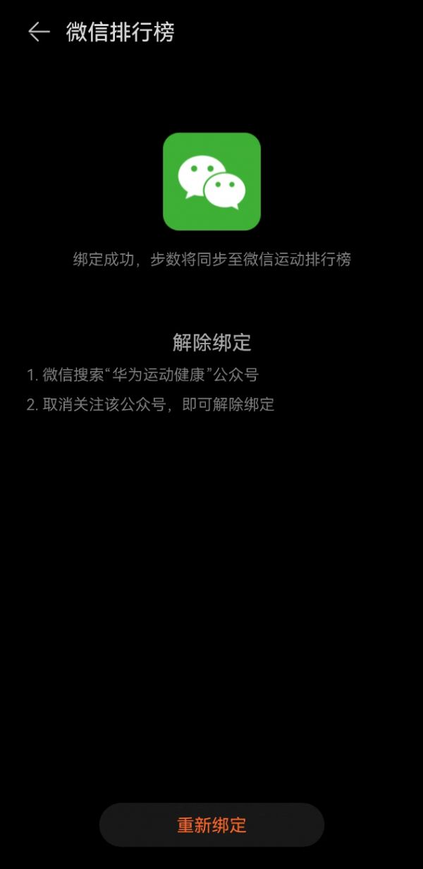 我們可以根據(jù)上面的指引,先在微信中取消關(guān)注"華為運(yùn)動(dòng)健康"公眾號(hào),然后在點(diǎn)擊"重新綁定"。