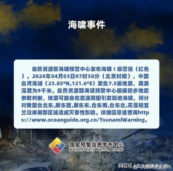 4月3日,自然資源部海嘯預(yù)警中心發(fā)布海嘯Ⅰ級(jí)警報(bào)(紅色)。2024年4月3日07時(shí)58分(北京時(shí)間),中國(guó)臺(tái)灣海域(23.85°N,121.6°E)發(fā)生7.5級(jí)地震,震源深度為9千米。自然資源部海嘯預(yù)警中心根據(jù)初步地震參數(shù)判斷,地震可能會(huì)在震源周圍引發(fā)局地海嘯。