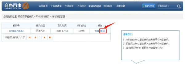 企業(yè)可登錄商務百事通網站,在IC卡預約頁面右側的IC卡預約窗口—預約管理模塊,查詢并撤回當天的代辦預約記錄。