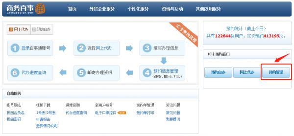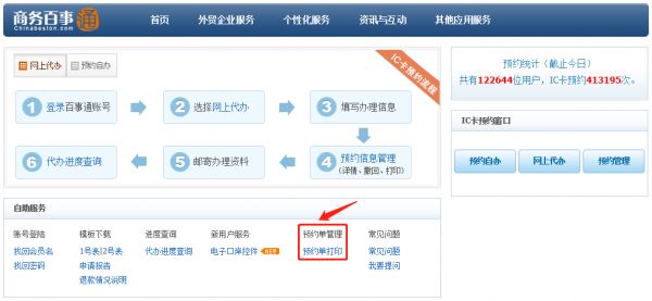 方法二:企業(yè)可登錄商務百事通網站,在IC卡預約頁面右側的IC卡預約窗口—預約管理模塊,通過預約號找到并打印預約單。