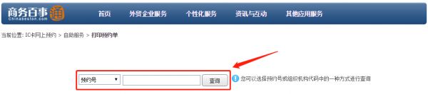 方法一:企業(yè)可登錄商務百事通網站,在IC卡預約頁面下方的自助服務—預約單管理模塊,通過預約號或組織機構代碼證號查詢并打印預約單。
