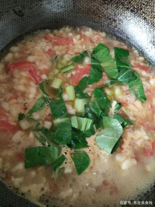 西紅柿切丁油菜,蔥花和一碗面糊。蔥花熗鍋,放醬油入西紅柿,炒幾下放水燒開,把面糊放漏勺里,面糊就像小蝌蚪一樣下到鍋里了。再放油菜燒開鍋就ok。又好吃又好看的粥,喝了心里暖暖的。