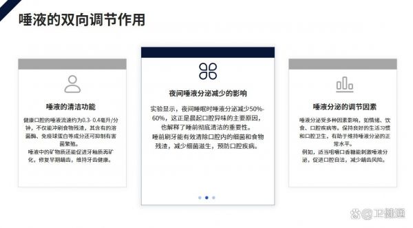 健康口腔的唾液流速約為0.3-0.4毫升/分鐘,不僅能沖刷食物殘?jiān)浜械娜芫?、免疫球蛋白等成分還可抑制有害菌繁殖。實(shí)驗(yàn)顯示,夜間睡眠時(shí)唾液分泌減少50%-60%,這正是晨起口腔異味的主要原因,也解釋了睡前徹底清潔的重要性。