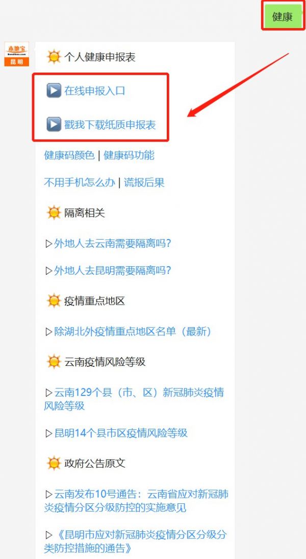 小編提示:搜索關(guān)注【昆明本地寶】微信公眾號(hào),在聊天對(duì)話(huà)框發(fā)送【健康】即可獲??!還能了解云南健康碼的作用、查看不同顏色健康碼的區(qū)別、查看云南健康碼答疑匯總、了解外地人去云南是否需要隔離、獲取除湖北外重點(diǎn)疫情地區(qū)名單等實(shí)用指南!