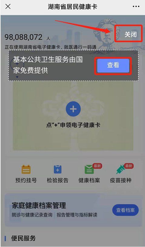 第四步:此步會顯示“基本公共衛(wèi)生服務(wù)由國家免費(fèi)提供”閱讀提醒,想了解可點(diǎn)擊“查看”,若想直接申領(lǐng)健康碼,可點(diǎn)擊“關(guān)閉”跳過閱讀。