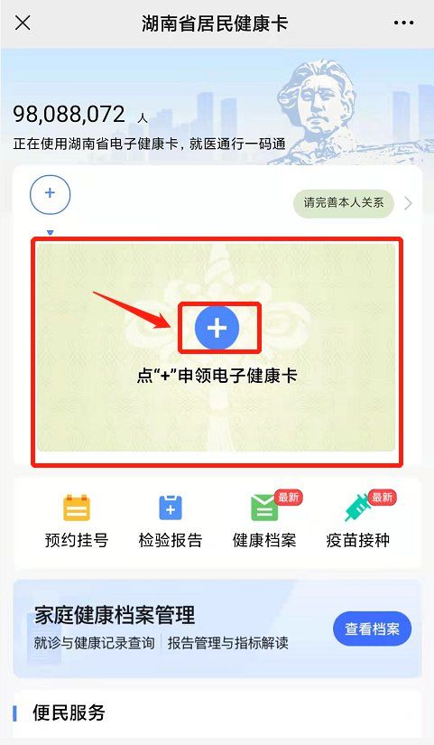 第五步:在關(guān)閉“基本公共衛(wèi)生服務(wù)由國家免費(fèi)提供”閱讀提醒后,會顯示出以下界面,點(diǎn)擊”+“號開始申領(lǐng)健康碼。