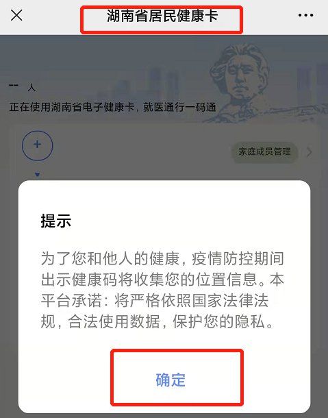 第三步:進(jìn)入“湖南省居民健康卡”界面后,會顯示“提示”信息,點(diǎn)擊“確定”進(jìn)入下一步。