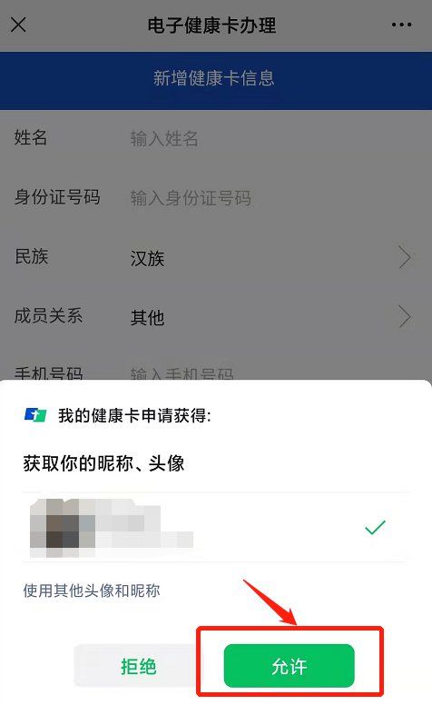第六步:在健康卡信息界面,先進(jìn)行”授權(quán)“允許,點(diǎn)擊”允許“后,開始填寫健康卡信息。