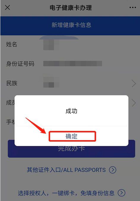 第七步:仔細(xì)填寫個(gè)人姓名、身份證號碼和手機(jī)號碼,填好后點(diǎn)擊”完成辦卡“,會彈出”成功“界面,點(diǎn)擊”確定“后,即成功申領(lǐng)湖南居民健康卡。