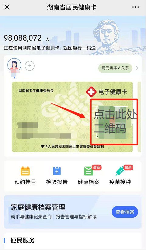 第八步:在自己的湖南省居民健康卡界面,點(diǎn)擊卡面右側(cè)的”二維碼“,即可進(jìn)入”健康碼“界面。