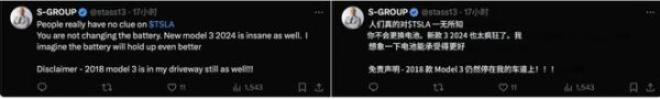 網(wǎng)友S-GROUP 在評(píng)論區(qū)表示深有同感:“特斯拉完全不需要換電池,我2018年入手的Model 3,現(xiàn)在駕駛表現(xiàn)依然很能打。”