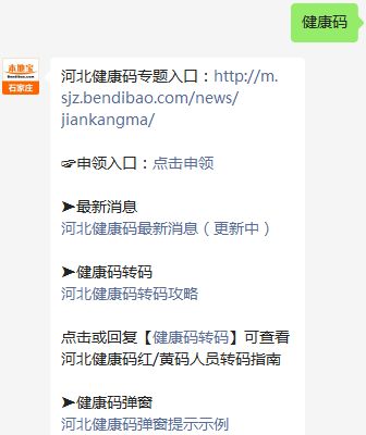 溫馨提示:搜索微信公眾號石家莊本地寶,關注后在對話框回復【健康碼】可獲河北健康碼最新功能指南,包括轉(zhuǎn)碼/報備、賦碼彈窗申訴、老幼助查及涉疫風險自報等。