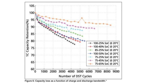 從上面張圖中我們可以看到100%-25%(黑色)容量損失最快、壽命最短,85%-25%(綠色)其次,75%-65%的容量損失最慢、壽命最長。
