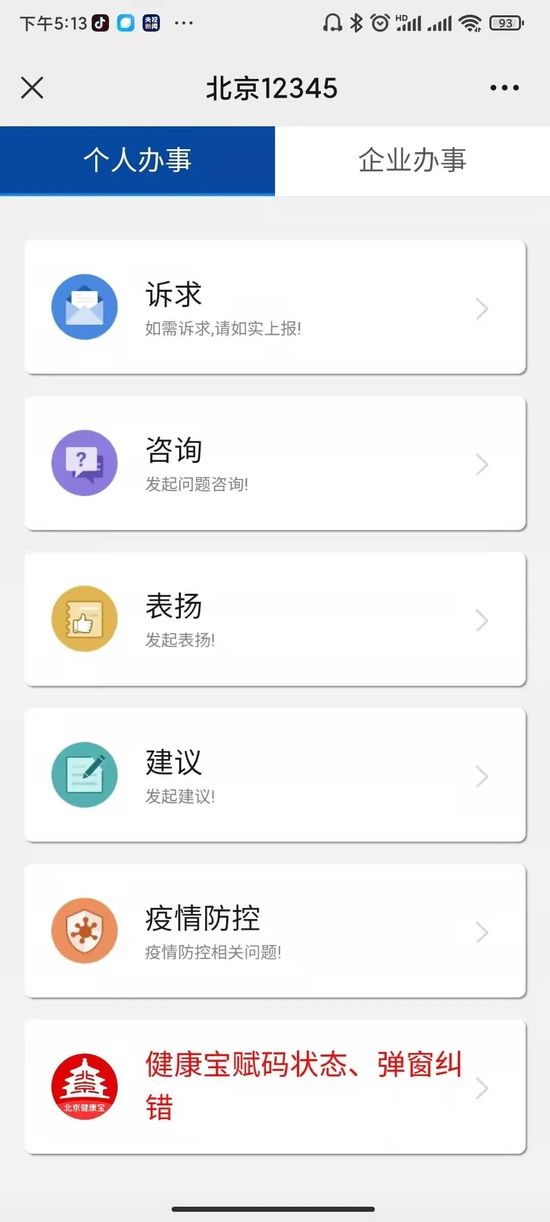 第二步:微信搜索“北京12345”公眾號——點“服務”——民意直通——勾選已閱讀——“健康寶賦碼狀態(tài)彈窗糾錯”——進入填信息頁面(沒注冊的先注冊、在登陸才能填寫信息)。