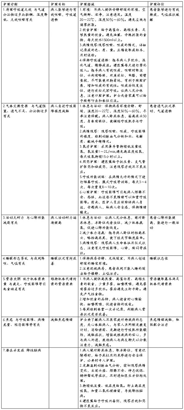 現(xiàn)病史:患者二十年前出現(xiàn)咳嗽、咳痰,咳少量白粘痰,偶有黃濃痰。多在清晨明顯,夜間有陣咳,伴活動(dòng)后氣喘,休息可以略好轉(zhuǎn),冬春季好發(fā),每年長(zhǎng)達(dá)三個(gè)月,反復(fù)發(fā)作,經(jīng)肺功能、X胸片檢查診斷為“慢性阻塞性肺疾病”,三天前患者受涼再次咳嗽咳痰,氣喘明顯,稍動(dòng)即氣喘。今入院,病程無胸痛、無咯血。食納差睡眠欠佳,大小便正常