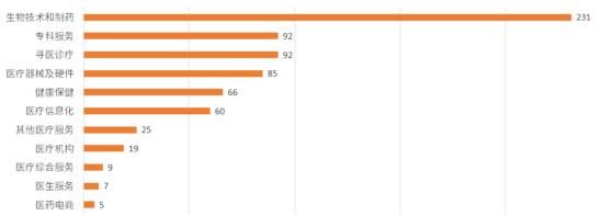 2018-2019年中國醫(yī)療健康領(lǐng)域的融資與并購事件數(shù)量居于第二位,超過一千件。而企業(yè)服務(wù)、硬件領(lǐng)域的項(xiàng)目融資與并購事件數(shù)則分別位于第一、第三位??梢?018-2019年中國大健康產(chǎn)業(yè)的融資熱度處于較高水平。