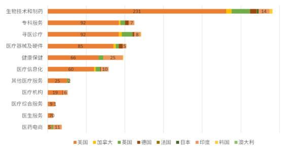 2018-2019年大健康產(chǎn)業(yè)的境外投資中,美國在各領(lǐng)域都占最大的比重。其中,生物技術(shù)與制藥、??品?wù)、尋醫(yī)診療、醫(yī)療信息化和醫(yī)療器械與硬件是投資熱度較高的領(lǐng)域。