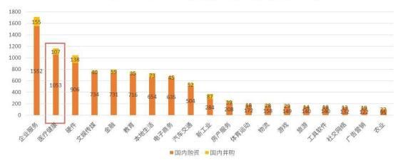 圖表:2018-2019.7年中國各行業(yè)融資與并購事件數(shù)量分布
