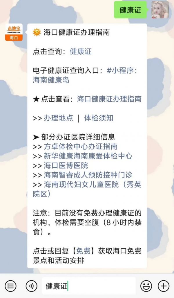溫馨提示:微信搜索公眾號【海口本地寶】,關(guān)注后在對話框回復(fù)【健康證】可獲海南電子健康證查詢?nèi)肟?、健康證辦理指南、地點及電話、體檢費用、體檢須知等。