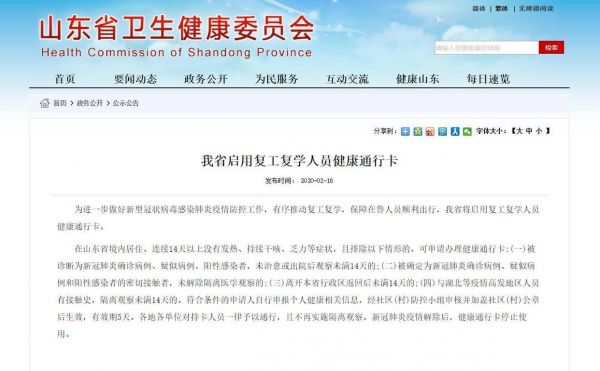山東將啟用復工復學人員健康通行卡!各地各單位對持卡人一律放行