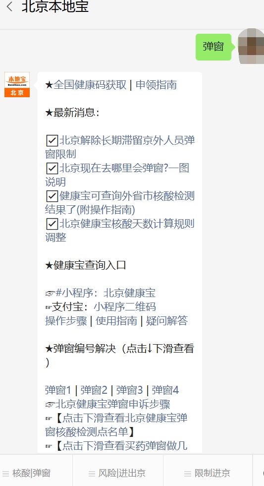 溫馨提示:微信搜索公眾號【北京本地寶】,關(guān)注后在對話框回復(fù)【彈窗】獲北京健康寶彈窗1234解決辦法(京內(nèi)/外地)、綠碼申領(lǐng)、去哪里會彈窗、老人小孩/外地核酸結(jié)果查詢。
