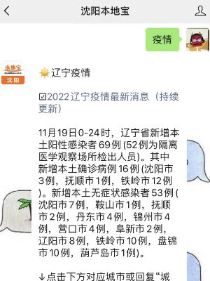 溫馨提示:微信搜索公眾號【沈陽本地寶】,關(guān)注后在對話框回復【疫情】可獲2022遼寧疫情最新消息、病例行程軌跡、相關(guān)疫情通告及風險等級查詢?nèi)肟诘取?/p>