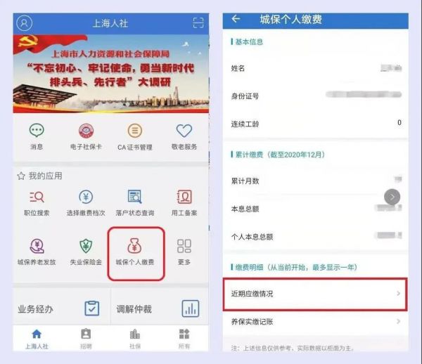 方法2:下載安裝“上海人社”APP,然后進入首頁,點擊”更多“;然后進入,選擇”城保個人繳費“-“近期應(yīng)繳情況”即可在界面中查詢到近一年的繳費基數(shù)和基本養(yǎng)老保險、醫(yī)療保險、失業(yè)保險的個人繳費額。