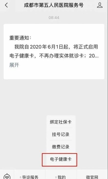 1. 進入微信公眾號“成都市第五人民醫(yī)院服務(wù)號”,點擊“我的-電子健康卡”