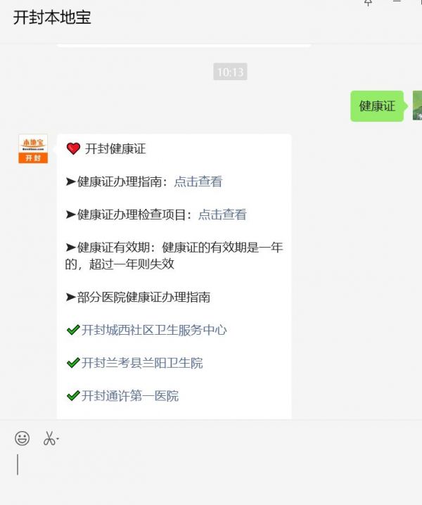 溫馨提示:微信搜索公眾號【開封本地寶】,關(guān)注后在對話框回復【健康證】可獲取開封健康證辦理方法,包括辦理條件、材料、費用、時間和地點,體檢項目類型,領(lǐng)取時間等信息(持續(xù)更新)