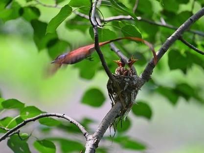 在綬帶鳥迎接新生之際,又迎來了新的鄰居——相思鳥。它們輕盈地落在樹枝上,好奇地打量著四周,似乎也被綬帶鳥的歡快氛圍所感染。在共同的環(huán)境中,多種鳥類生活、成長與互動的場景,象征著生物多樣性的和諧美。為了孩子們的成長,千里之外的小鳥們在枝頭相聚,共同書寫這段動人的生命故事。