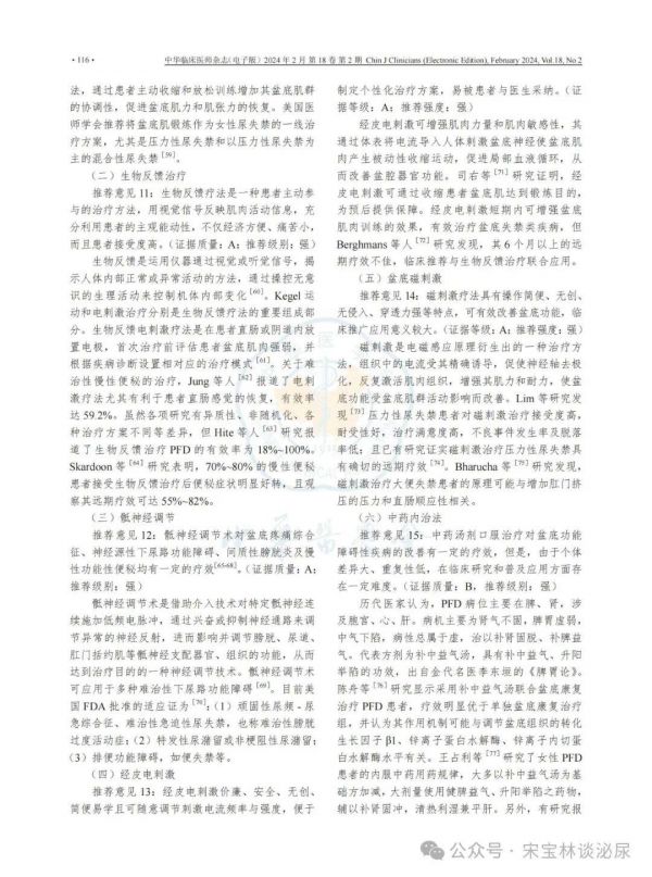 總之,《盆底功能障礙性疾病診斷及康復(fù)治療專家共識(2024版)》為臨床醫(yī)生提供了一個全面而規(guī)范的參考,強調(diào)了多學科整合和循證醫(yī)學的重要性,同時也指出了PFD治療中的個體化需求和多樣化治療手段的應(yīng)用價值。這份共識不僅是臨床實踐中的指南,也為未來的研究和臨床應(yīng)用提供了重要方向。