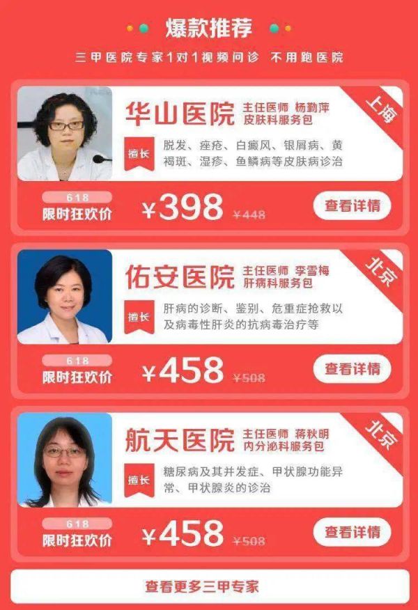 您可以享受 上海華山醫(yī)院皮膚科、北京佑安醫(yī)院肝病科、北京航天醫(yī)院內分泌科、北京天壇醫(yī)院呼吸科、上海復旦附屬中山醫(yī)院心內科、中國醫(yī)科大學附屬第一醫(yī)院胸外科、中日友好醫(yī)院腫瘤放射治療科等三甲醫(yī)院專家的服務,15分鐘1對1視頻問診,足不出戶,享受名醫(yī)診療。